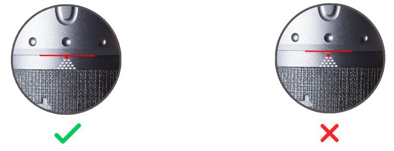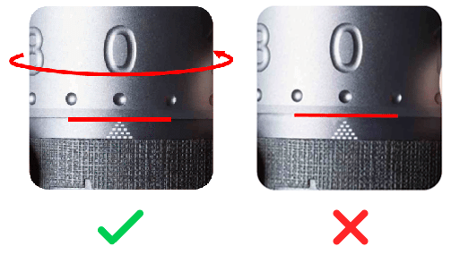 ![]() | Richten Sie die #0 an der Skalenmarkierung und dem Boden aus. Die Kante des Einstellrings berührt die erste Stufe der Skalenmarkierung. |