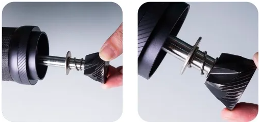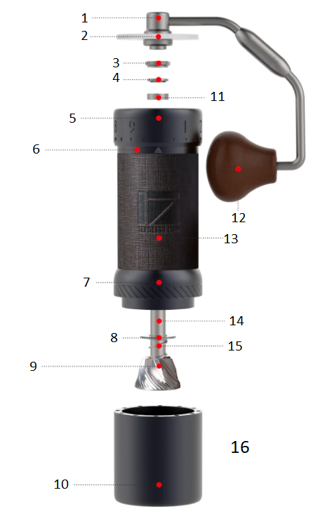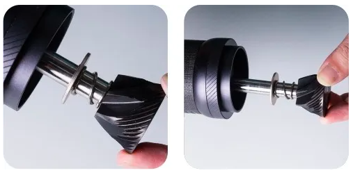 Den Gratring vorwärts drehen (Gewinde gegen den Uhrzeigersinn). Demontage des Einstellrings wird nicht empfohlen. Reinigen Sie die Mühle nicht mit Wasser. Eine Reinigung mit Bürste und Gebläse wird empfohlen. |