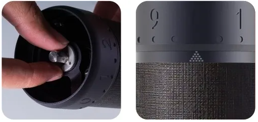 ![]() | Die Rändelmutter zum Kalibrieren festziehen. die Mühle, während man von unten auf den Mahlstein drückt. Hinweis: Es sind insgesamt viereinhalb Umdrehungen. vom Startpunkt aus gezählt. Der Startpunkt könnte Die Abweichung kann je nach Anzugskraft bis zu ±10 Klicks betragen. die Mutter und das Zifferblatt. |