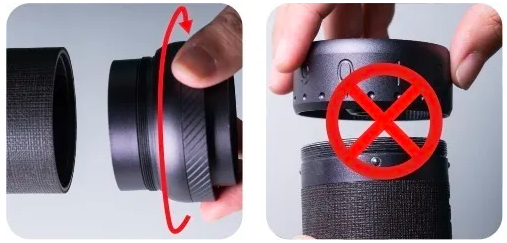 ![]() | Drehen Sie den Einstellring im Uhrzeigersinn um etwa zwei Umdrehungen drehen und die Rändelmutter entfernen. Gegen den Uhrzeigersinn drehen und dabei den Grat drücken. |