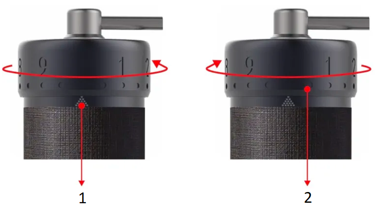 - Die pyramidenförmige Skalenmarkierung besteht aus mehreren Quadraten, die die Anzahl der Umdrehungen anzeigen, und wird kleiner, wenn Sie gröbere Einstellungen vornehmen.